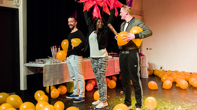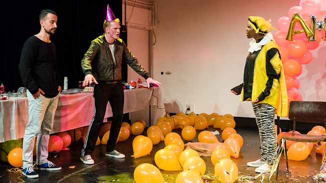 Drie personages wachten op de vluchteling Amjad, voor wie ze een welkomstfeestje aan het organiseren zijn. Maar tijdens het versieren en opblazen van de ballonnen, botsen de onderlinge extreme meningen op alle mogelijke manieren en loopt het nogal uit de hand…